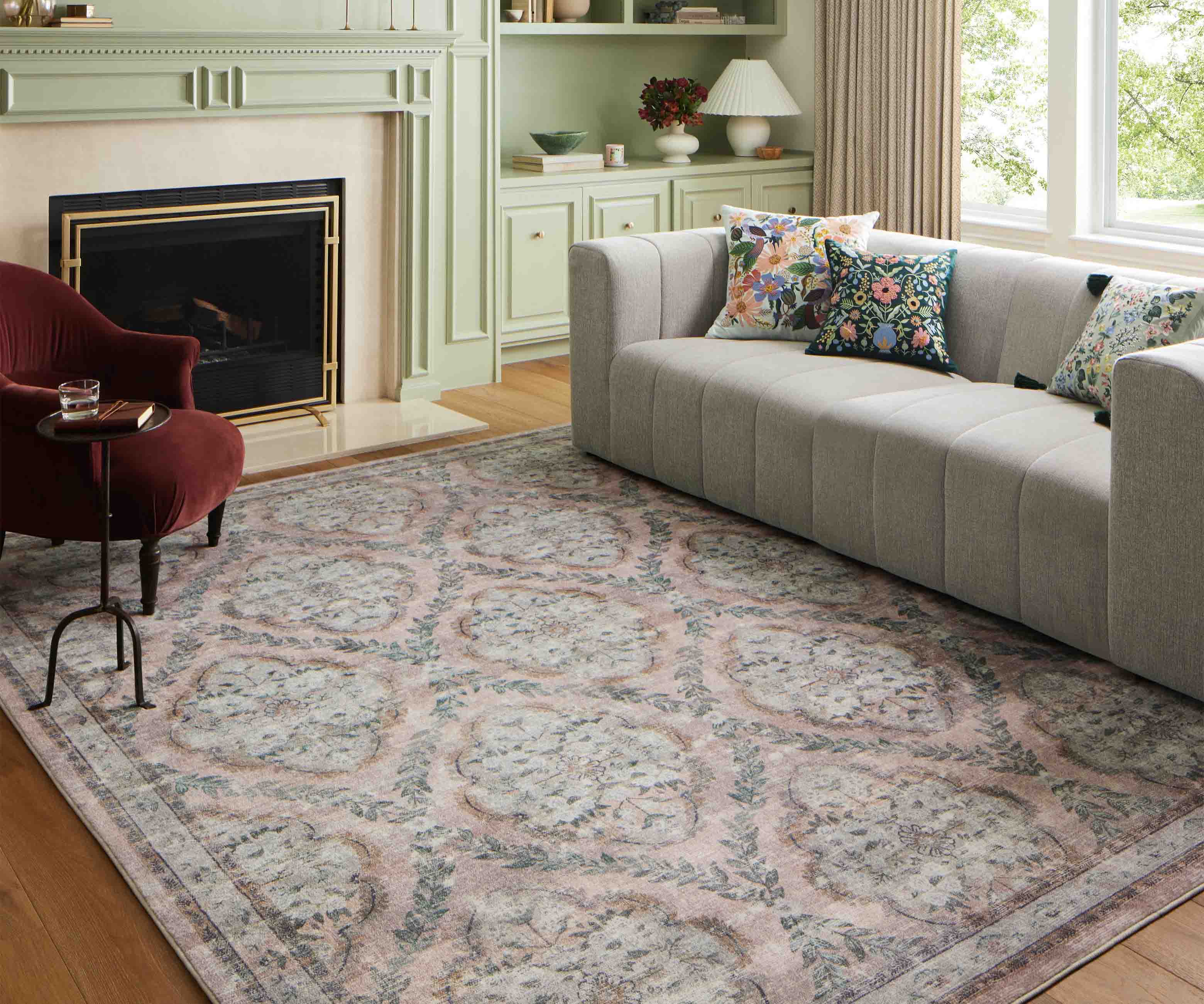 An offset grid of floral medallions creates the illusion of a curved ogee pattern on our Courtyard Chateau rug, available in both deep colorways and elegant pastels. The Courtyard collection was made with Loloi’s CloudPile? construction, an incredibly soft fabrication that combines the best of affordable printed rugs with the plushness of a pile. Part of our Rifle Paper Co. × Loloi collaboration. The layout and scale of our rugs is adjusted to accommodate each available size, and may be different than what is pictured here. Images of each size are available by hovering over the desired size on our desktop site.