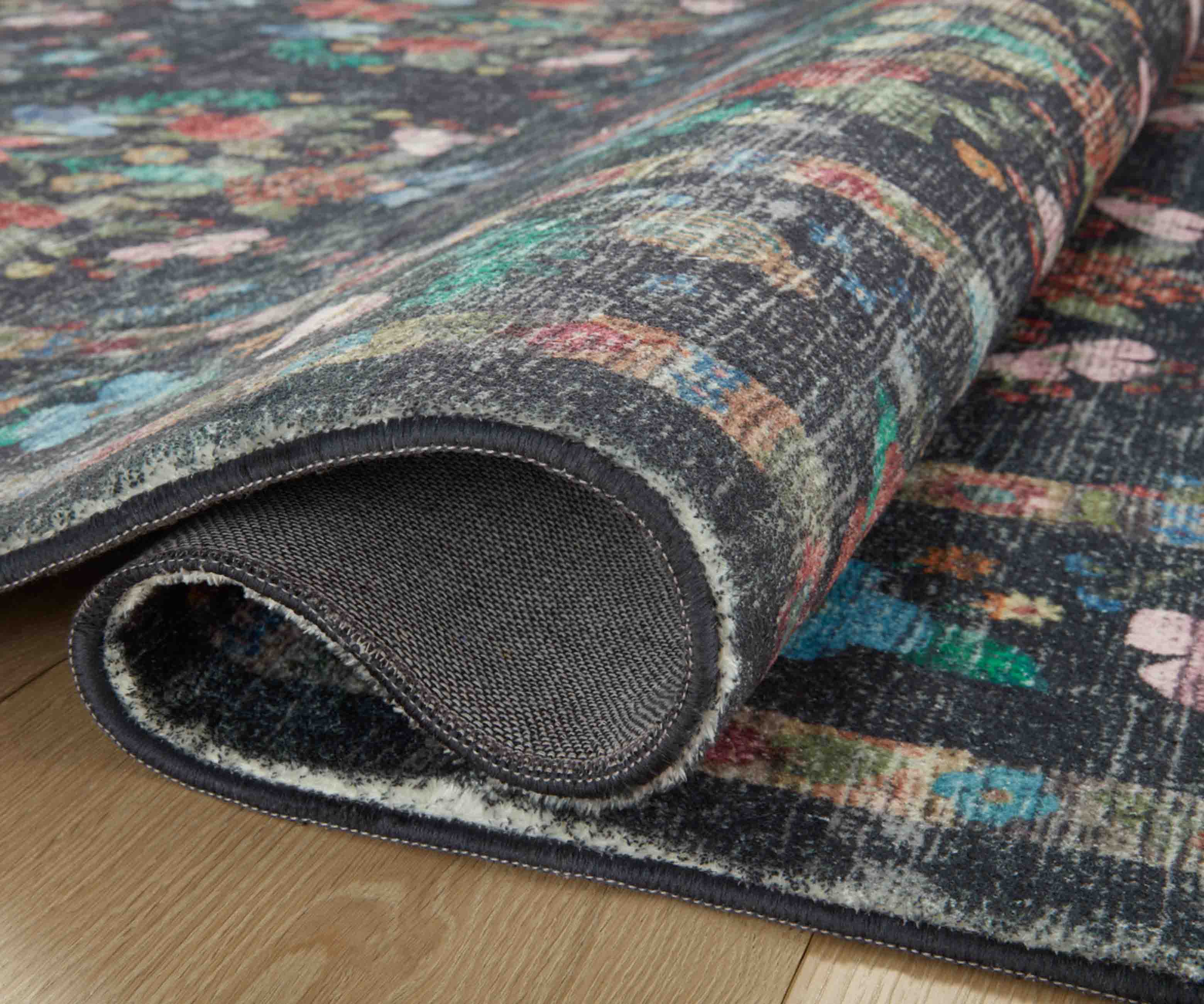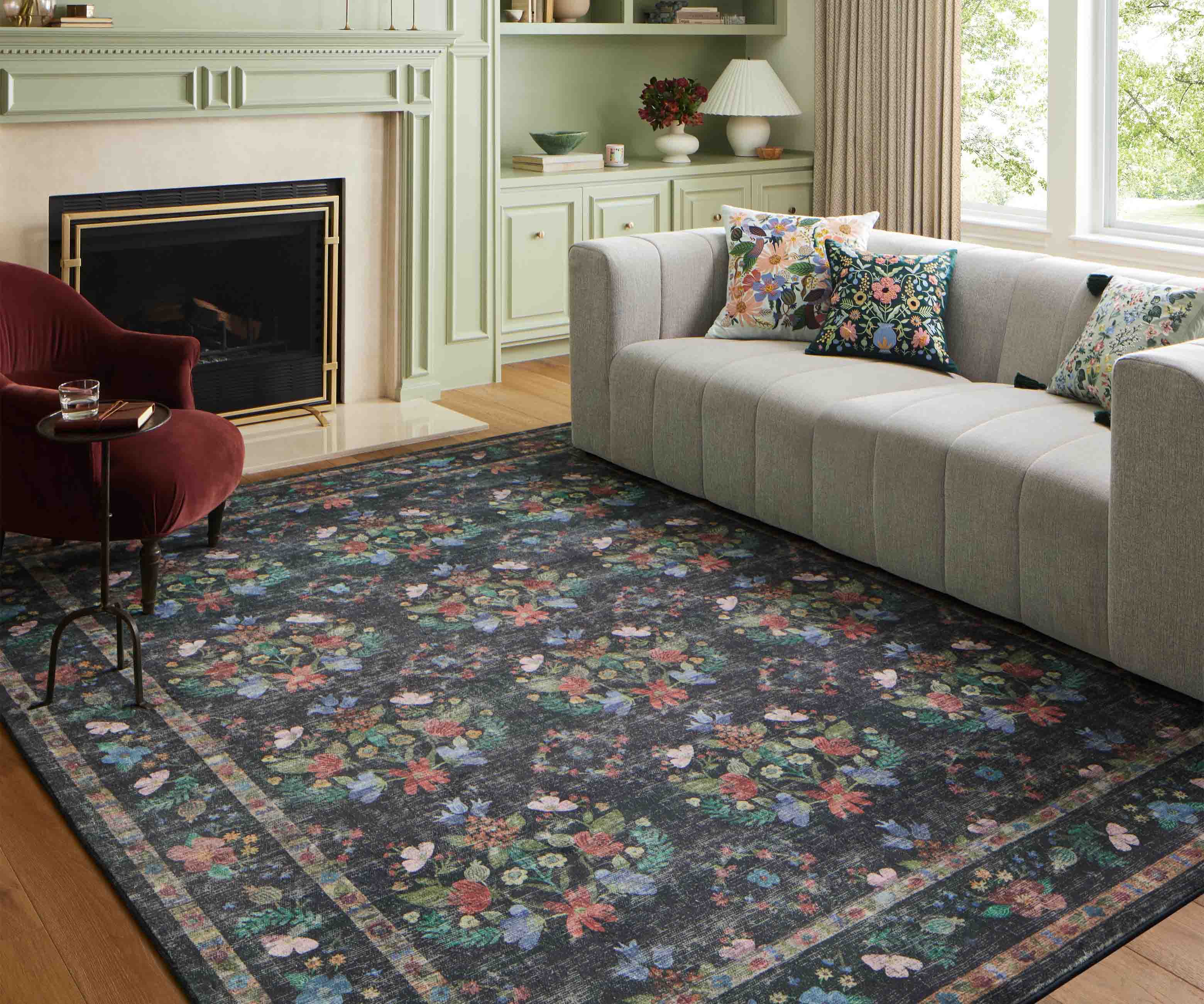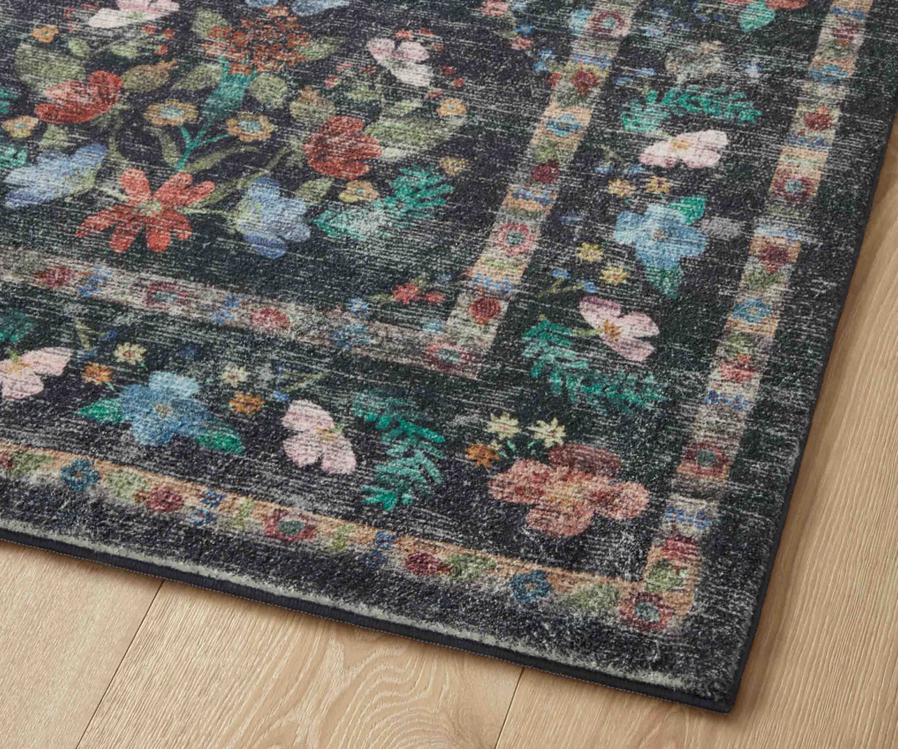 Mirrored floral clusters bloom against the dark background of our Seville rug, offset by a contrasting border featuring detailed designs. The Courtyard collection was made with Loloi’s CloudPile? construction, an incredibly soft fabrication that combines the best of affordable printed rugs with the plushness of a pile. Part of our Rifle Paper Co. × Loloi collaboration. The layout and scale of our rugs is adjusted to accommodate each available size, and may be different than what is pictured here. Images of each size are available by hovering over the desired size on our desktop site.