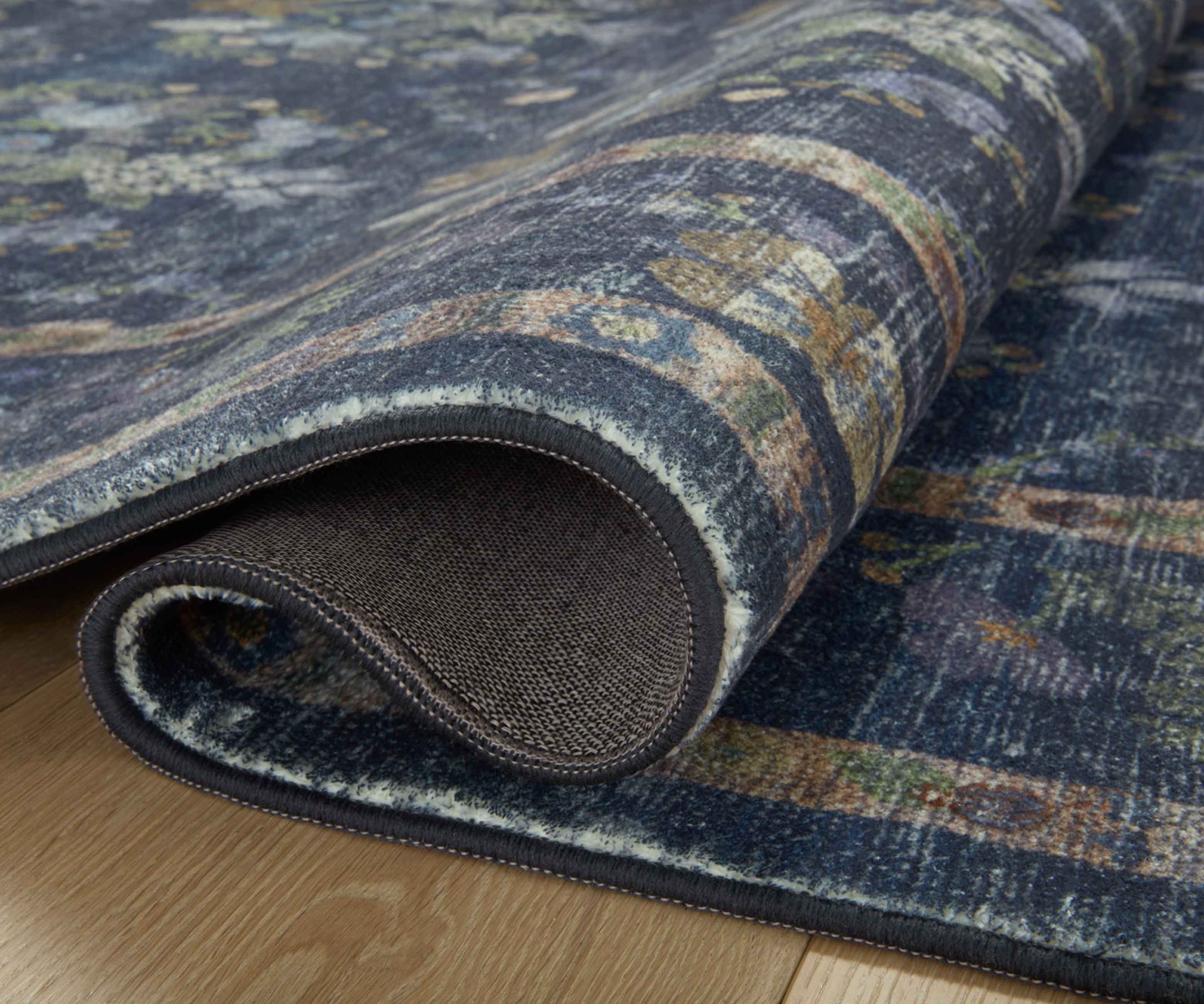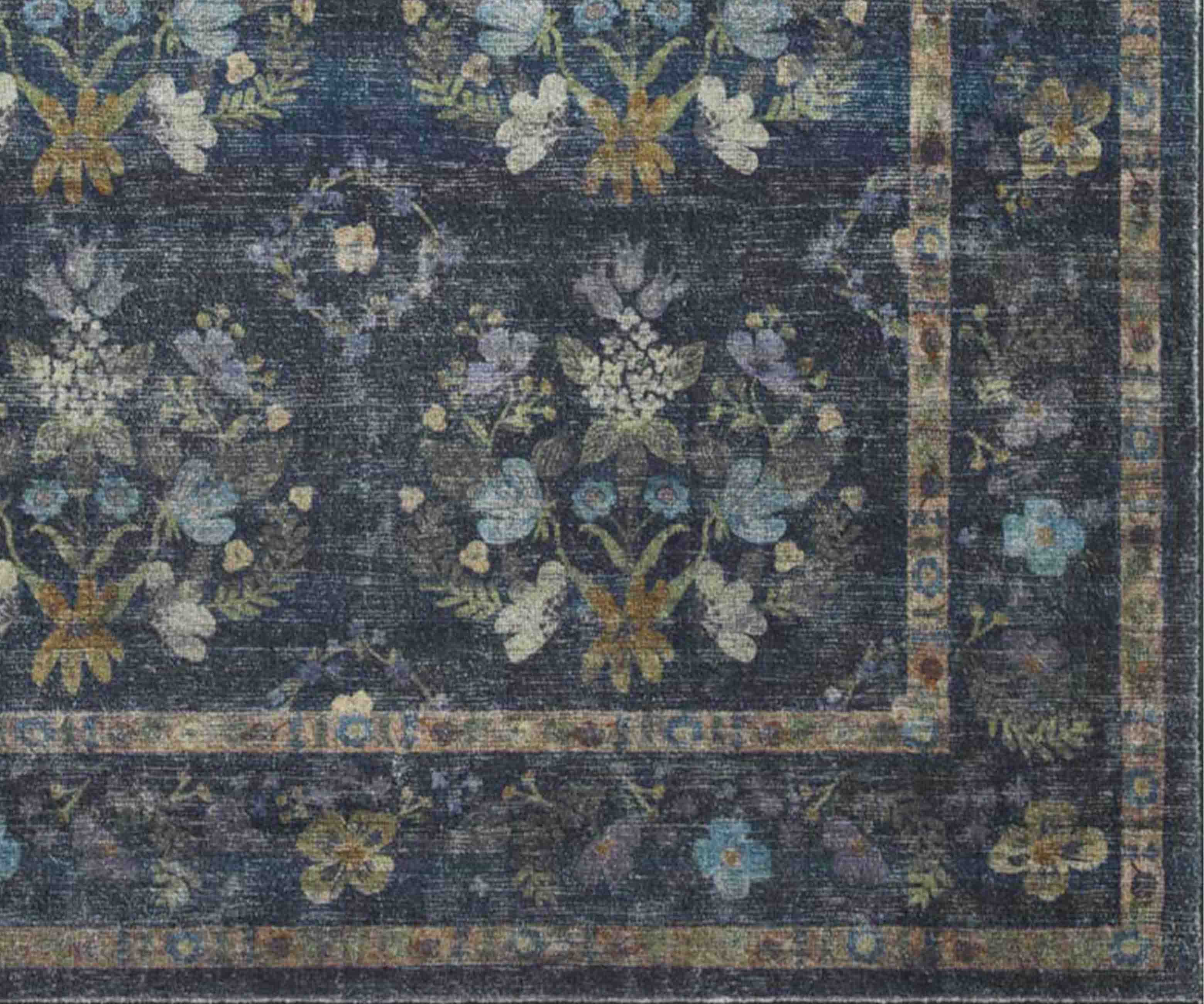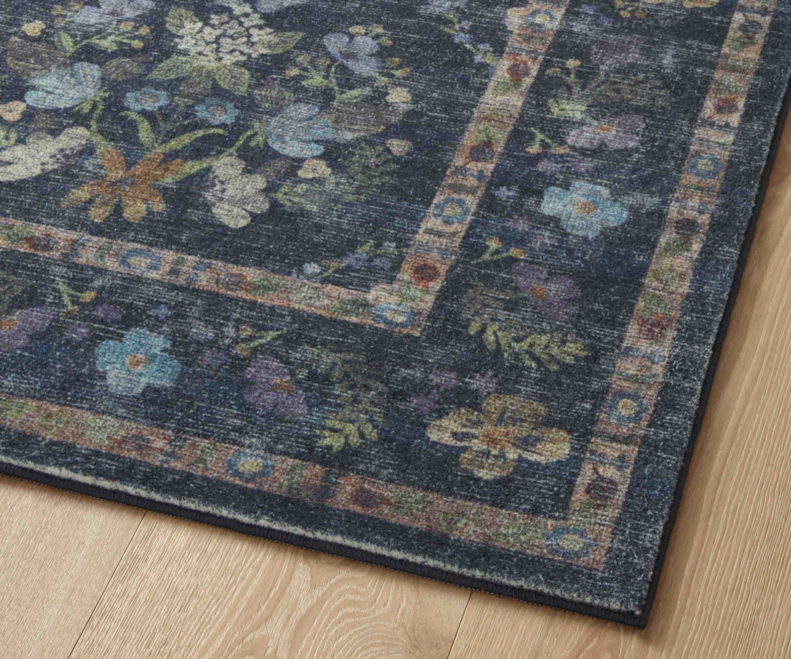 Mirrored floral clusters bloom against the dark background of our Seville rug, offset by a contrasting border featuring detailed designs. The Courtyard collection was made with Loloi’s CloudPile? construction, an incredibly soft fabrication that combines the best of affordable printed rugs with the plushness of a pile. Part of our Rifle Paper Co. × Loloi collaboration. The layout and scale of our rugs is adjusted to accommodate each available size, and may be different than what is pictured here. Images of each size are available by hovering over the desired size on our desktop site.